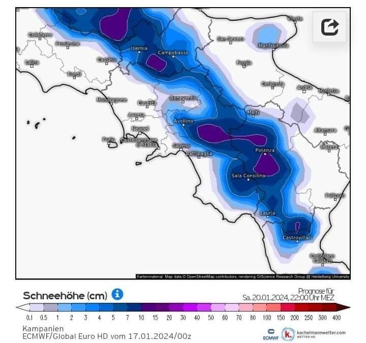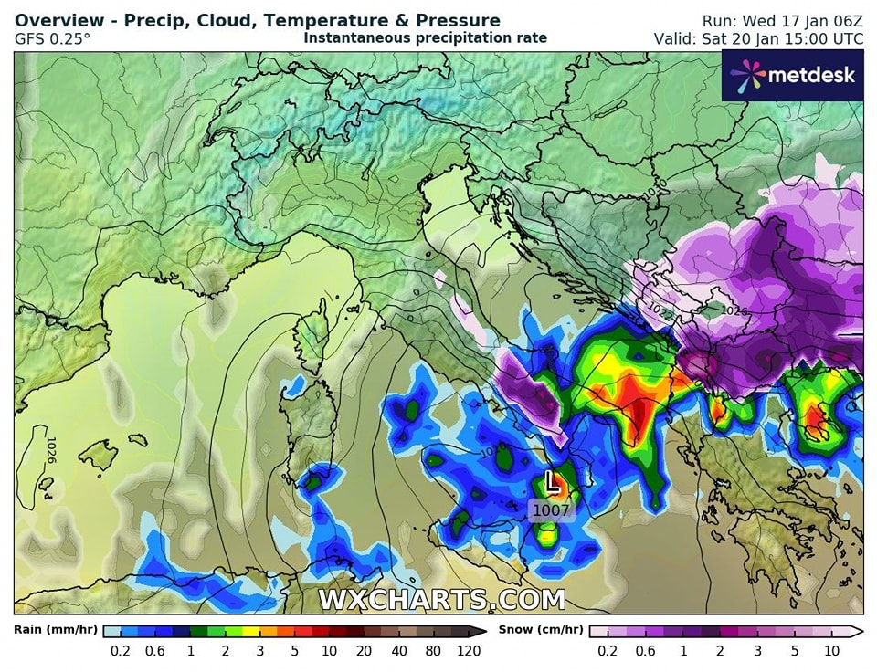 Infatti come vedete in cartina, per Sabato 20 Gennaio, il fronte freddo che avevamo segnalato dovrebbe raggiungere le nostre zone, con precipitazioni, calo termico per l’aria fredda in arrivo, richiamata da un minimo nel Tirreno, che di conseguenza potrebbe apportare fenomeni nevosi, lungo la nostra dorsale, a quote anche collinari.